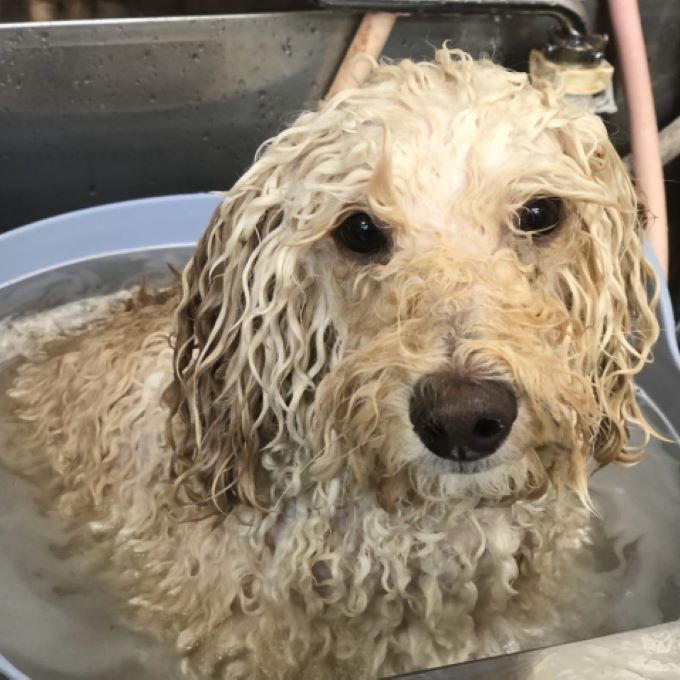 一般的に、汚れが落ちやすいシャンプーというのは、その分わんちゃんの皮膚への刺激も強くなってしまいます。当店では、日本全国のさまざまな低刺激シャンプーを試した結果たどり着いた、愛知県のこだわりメーカーさんの、皮膚への刺激が少ない自然由来の「アーユルニームシャンプー」と「手作り石鹸」を使用しています。シャンプーをする際には、シャンプー剤をわんちゃんの身体に直接塗ってゴシゴシするのではなく、特殊なスポンジを使用してきめ細かい泡を作り、あらかじめ汚れを浮かせた状態に泡をのせて、優しく揉み洗いをしていきます。
