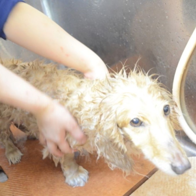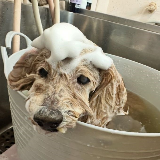 一般的に、汚れが落ちやすいシャンプーというのは、その分わんちゃんの皮膚への刺激も強くなってしまいます。当店では、日本全国のさまざまな低刺激シャンプーを試した結果たどり着いた、愛知県のこだわりメーカーさんの、皮膚への刺激が少ない自然由来の「アーユルニームシャンプー」と「手作り石鹸」を使用しています。シャンプーをする際には、シャンプー剤をわんちゃんの身体に直接塗ってゴシゴシするのではなく、特殊なスポンジを使用してきめ細かい泡を作り、あらかじめ汚れを浮かせた状態に泡をのせて、優しく揉み洗いをしていきます。